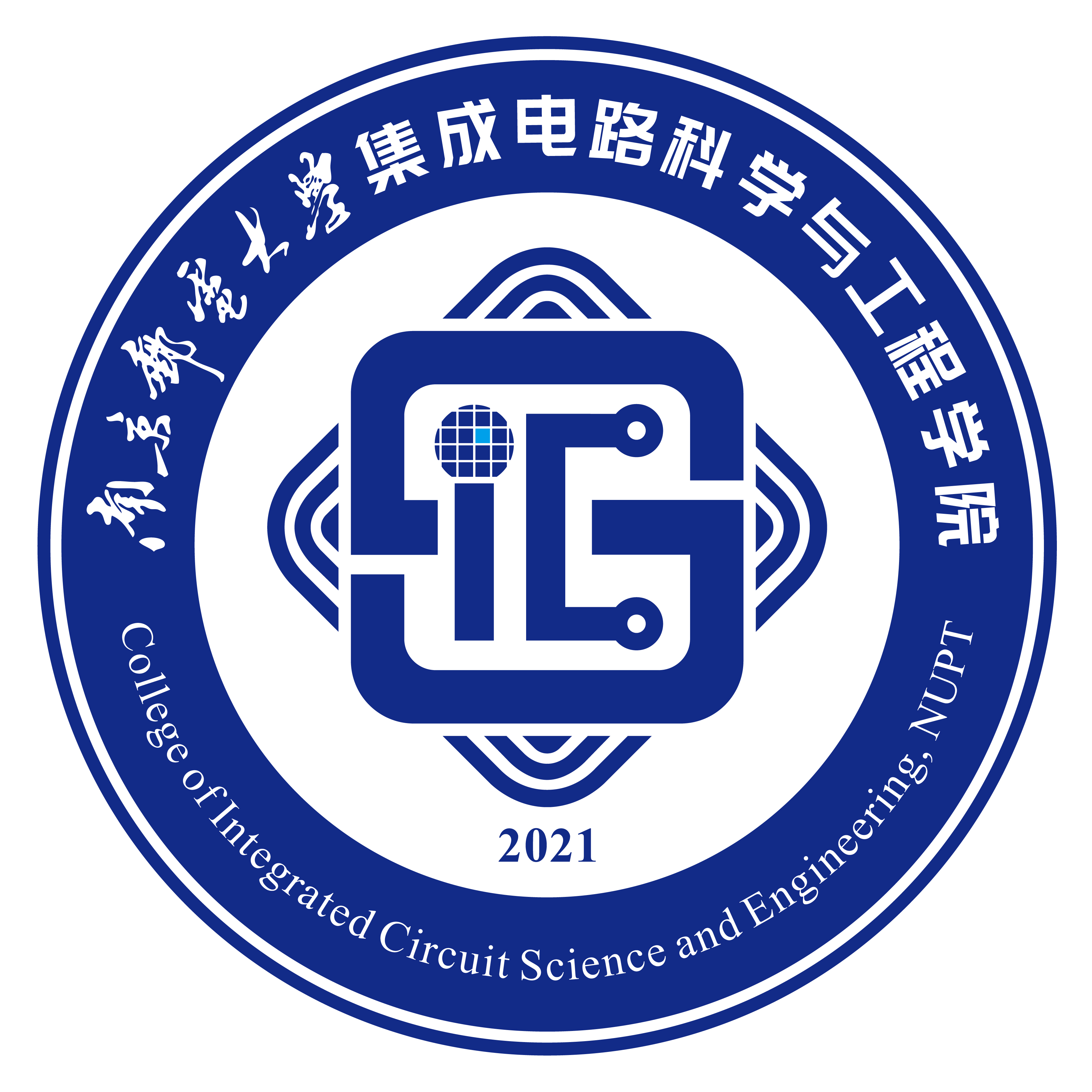 2.院徽内主体的两个正方形表示多层芯片封装;正方形四个角的波形设计突出我们的芯片是面向通信领域的学科特色;字母i上的圆点代表晶圆,其中一个醒目色点彰显出测试是黑料不打烊 的特色方向之一;底部2021明示建院时间。