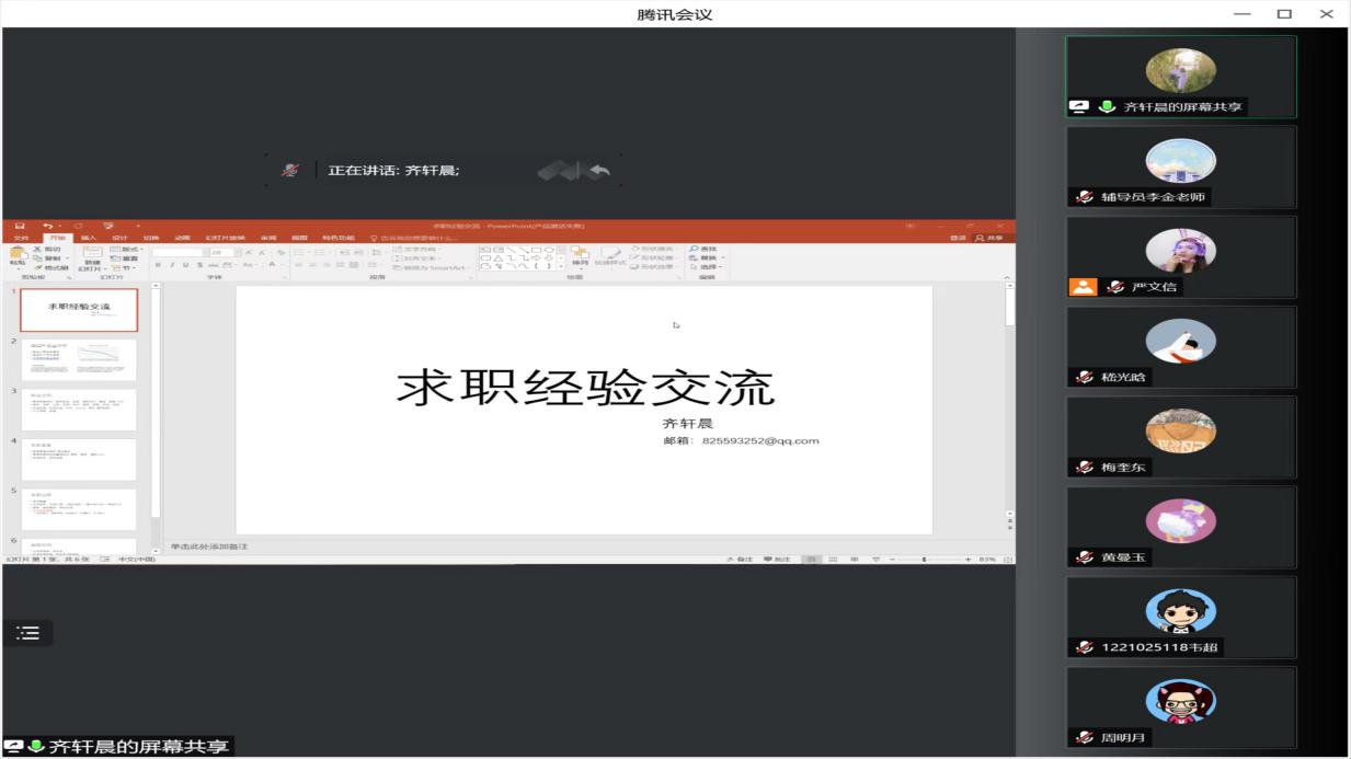 接下来是嘉宾求职就业经验分享,李浩学长从如何选择方向、城市、企业以及未来发展规划等四个方面进行讲解,建议大家将择业目光放的长远。周明月学姐强调一定要在简历上凸显自身与他人的独特性和差异性,这样才能更好地从众多应聘者中脱颖而出。齐轩晨学长为大家解读了当前的就业形势,鼓励大家只要每一步走的扎实,就一定能找到满意的工作。黄曼玉学姐主要对简历制作投递、面试表现以及如何及时复盘面试中自己的问题或优势等几个方面进行讲解。最后,嵇光晗学长强调了制定清晰的求职目标和有效率的进行信息搜集与共享非常重要。