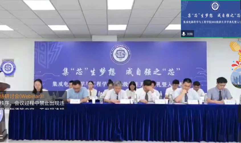 导师代表刘轶教授在云端与大家相会并发言。万丈高楼平地起,刘教授强调同学们要踏踏实实,从一点一滴做起,把握大学阶段的学习特点和规律,做好自我设计,确定阶段目标,尽快调整心态,在学好专业知识的前提下锻炼独立的科学思维能力。刘教授还带领同学们展望了芯片产业的广泛应用前景。