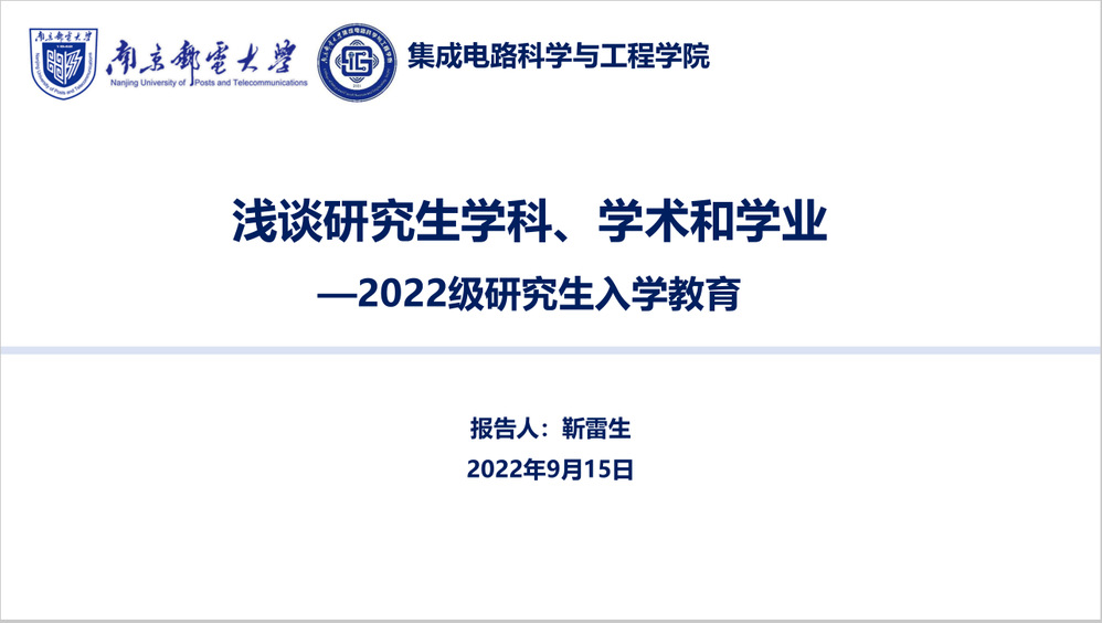 为帮助2022级研究生新生了解所学专业及其沿革,专业毕业要求,提高对学术道德规范的认识,培育求真务实的优良学风,9月15日下午,集成电路科学与工程学院通过腾讯会议以“浅谈研究生学科、学术和学业”为题,开展2022级研究生新生学科通识和学术诚信讲座。本次讲座由学院院长助理靳雷生老师主讲,2022级全体研究生新生参加。