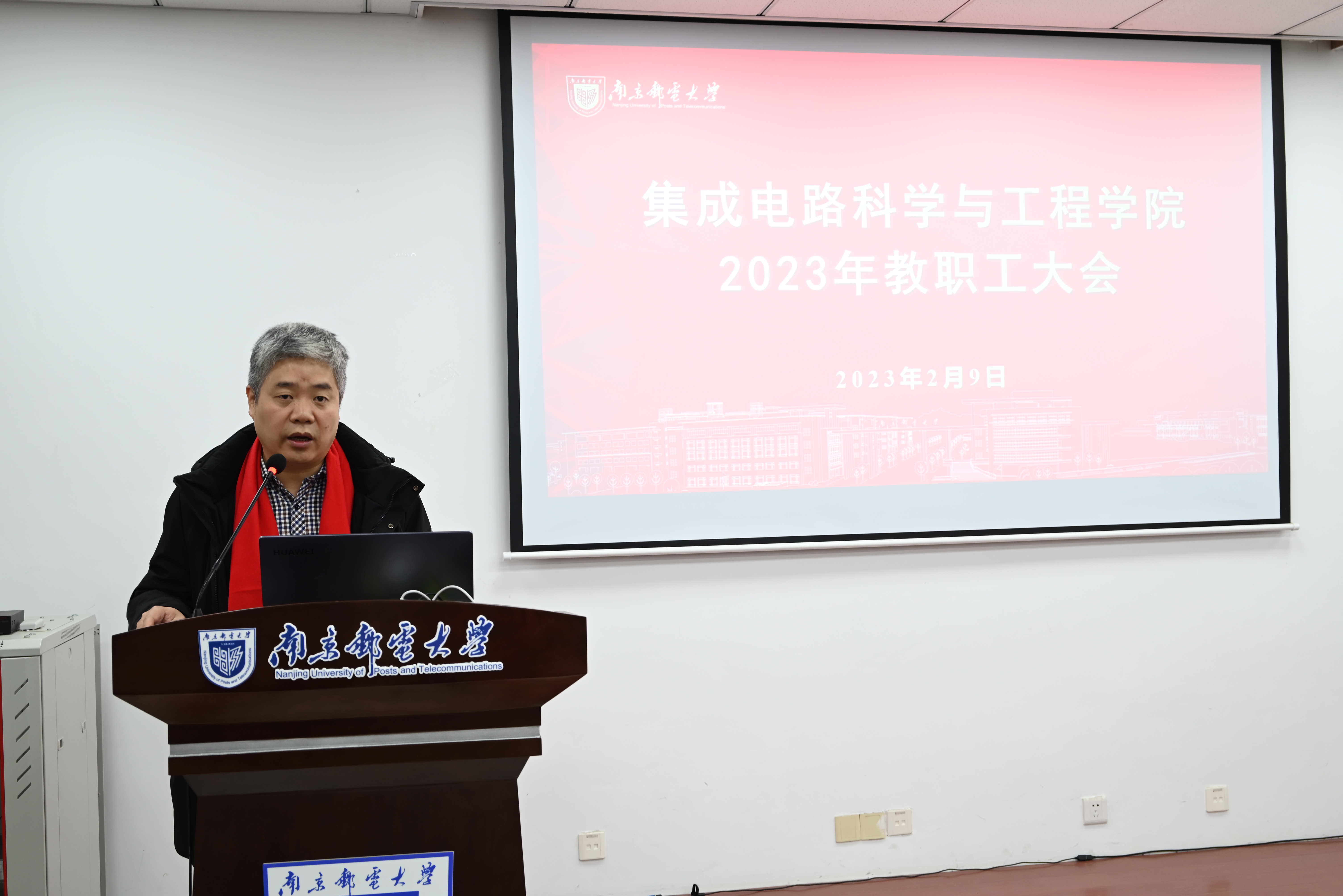 2月9日,集成电路科学与工程学院2023年全院大会暨2022年度述职大会在3号学科楼B322会议室线上和线下同时举行。校党委常委、副校长、学院院长郭宇锋,学院党委副书记乔祖琴,副院长蔡志匡,副院长肖建和全体教职工出席大会,学院党委书记高翔主持会议。