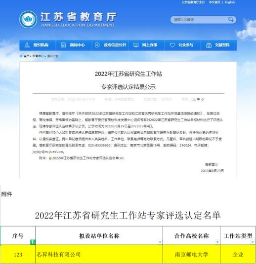 根据江苏省教育厅2022年8月发布《2022年江苏省研究生工作站专家评选认定结果公示》,确定了评选认定结果名单,其中我校与芯昇科技有限公司联合申报的“2022年江苏省研究生工作站”获批成立。
