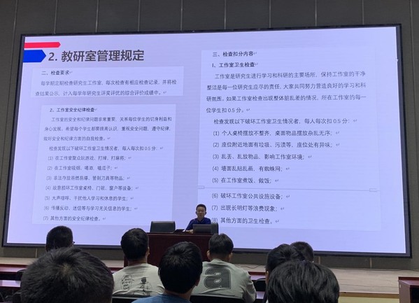 王怡钦老师从研究生学籍管理、评奖评优、考试纪律、宿舍和教研室管理规定等四个方面向同学们详细介绍了研究生日常管理内容。其中就考试纪律、学校各类资助政策和研究生期间主要学科竞赛等内容进行了重点讲解,希望同学们能够尽快完成角色转换,快速适应研究生生活。