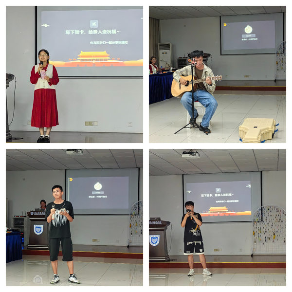 此外晚会还设置了节奏感强的“逛三园”、烧脑的“你画我猜”、灯谜对猜等多样化的游戏环节,吸引了同学们积极参与,教室内笑声此起彼伏,同学们都沉浸在欢快的氛围中,将晚会的氛围推向了高潮。游戏结束后,同学们拿起手边的彩色卡片,写下了对亲人和朋友最真挚的祝福,并将其中的一张卡片与在场同学进行了交换,不仅加强了同学们的互动交流,还让同学们之间实现了心与心的碰撞,感受到同学间的真诚与温暖。最后全体师生集体合唱《我和我的祖国》,整个教室都回荡着同学们的悠扬的歌声。