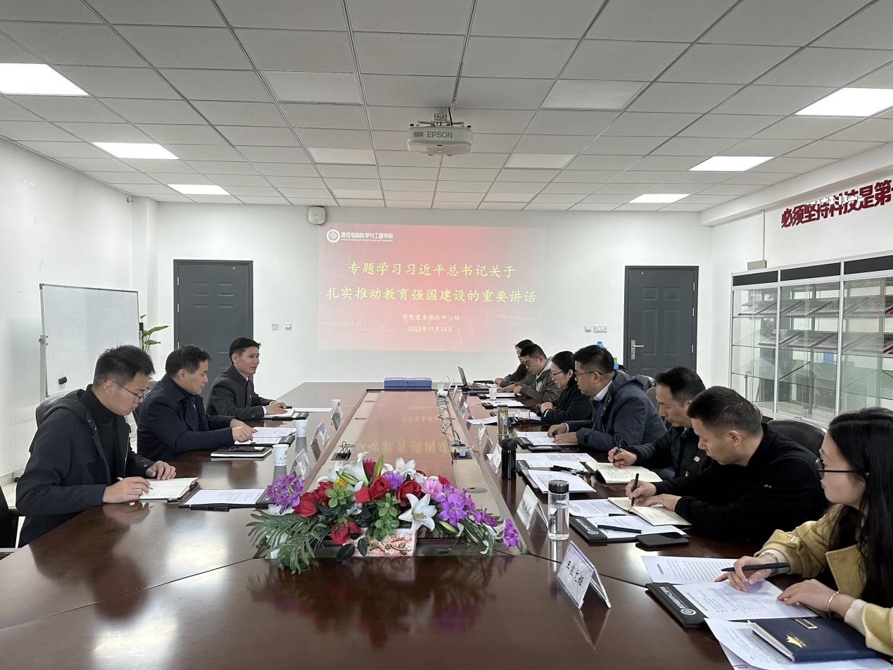 党委理论学习中心组在仙林校区电光B223会议室举行学习会,专题学习习近平总书记关于扎实推动教育强国建设的重要讲话。校党委巡学旁听工作第一组组长、校党委副书记蒋国平,宣传部副部长张丰,联络员王波一行莅会指导。学院党委理论学习中心组全体成员参加了会议,院党委书记高翔主持会议。