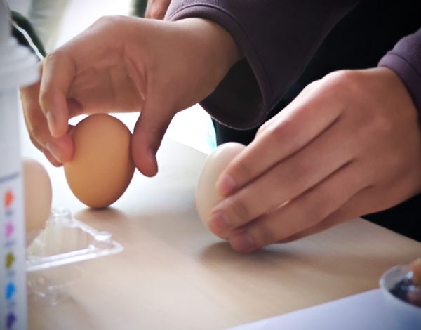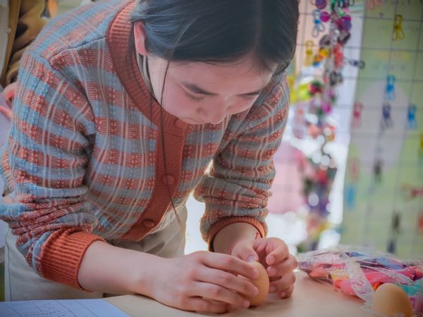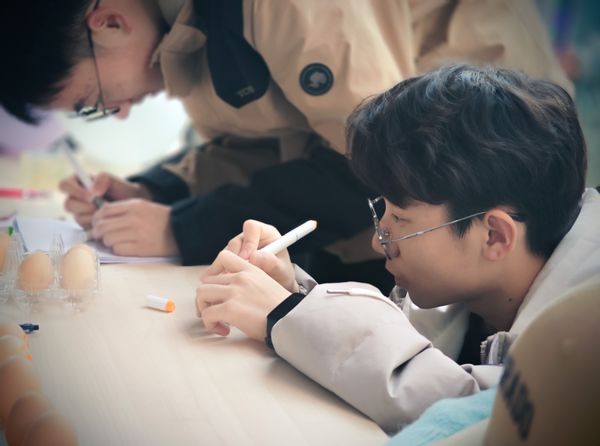 第二步——“专心立蛋”环节,限时90秒内,参与的同学们要想办法把鸡蛋立起来。虽然科学研究表明,春分当天最有利于立蛋,但实际上手并没有这么简单。起初,大家立蛋并不顺利,但经过多次尝试、互相交流,得出了结论。首先,寻找一颗好蛋(一端尖,另一端比较圆);其次,寻找一个比较稳定的支撑面;最后,需要保持手的稳定,不让蛋晃动,慢慢让其重心下沉。