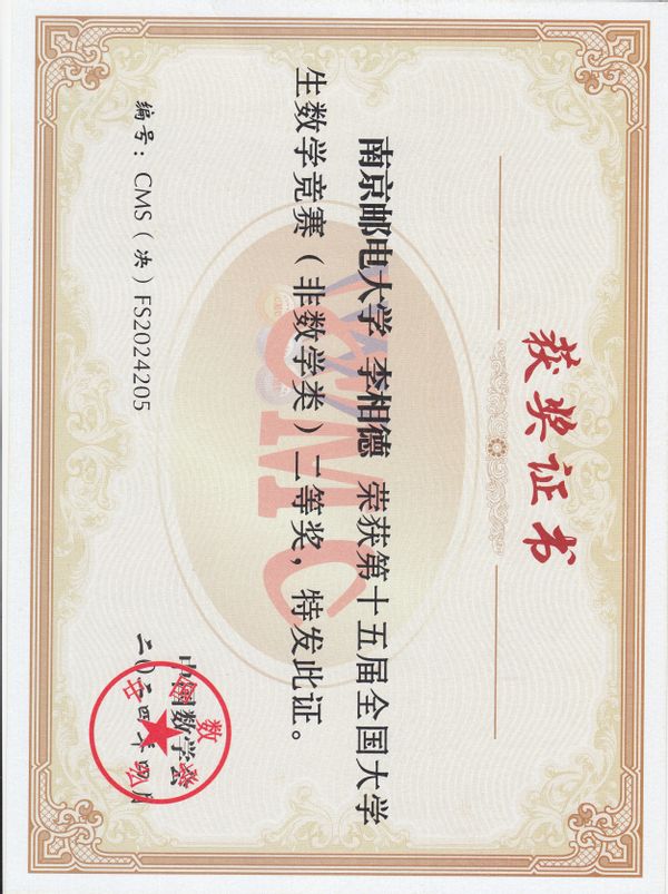 2024年4月20-21日,第十五届全国大学生数学竞赛决赛在山东大学举行。在本次竞赛中,我校取得了历史性突破的好成绩,4位非数学类参赛者全部获奖。其中,黑料不打烊 2022级微电子科学与工程专业的李相德同学荣获国家二等奖的好成绩!