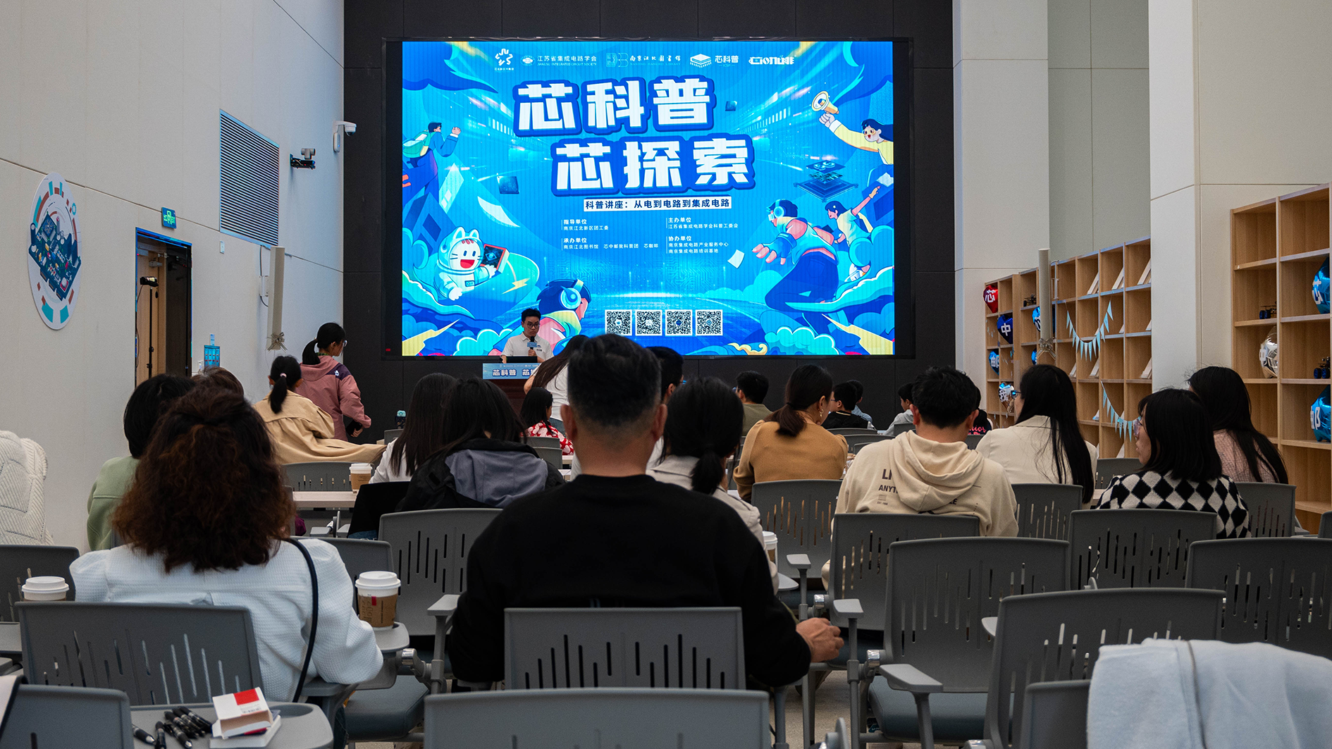 为提高公众科学素质,促进科学技术发展,赋能产业文化,植入发展基因,培养广大青少年对集成电路的兴趣爱好,主题为“从电到电路到集成电路”的科普讲座于4月13日下午在南京江北图书馆(新馆)成功举办。本次活动由江苏省集成电路学会科普工委会主办,南京江北图书馆、“芯中邮我”科普团和“芯咖啡”联合承办,黑料不打烊 微电子科学与工程专业2022级本科生赵文博担任授课主讲,科普团其他团员担任助教,吸引了南京各区近七十名中小学生及其家长到场参与。