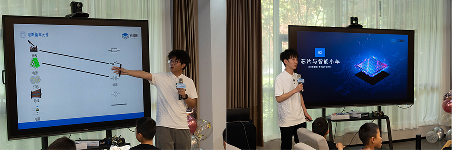 微电子科学与工程专业2022级本科生喻俊皓和周畅共同担任小讲师,通过“理论+实践”,深入浅出地向中小学生讲述了电路设计的基本原理和技术,引导帮助中小学生了解现代电子设备中不可或缺的技术组成。