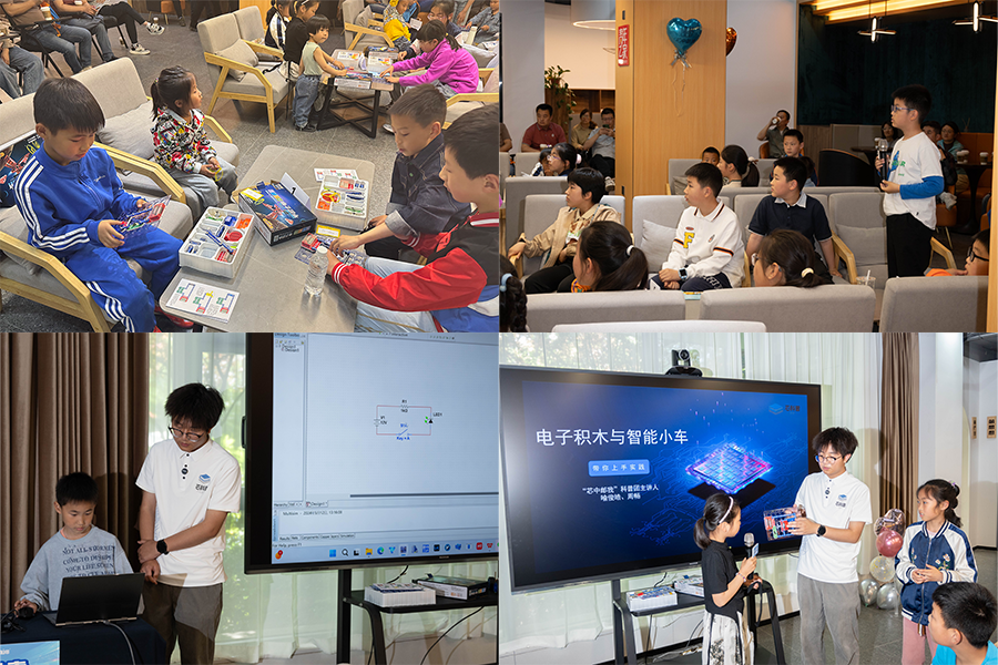 互动中,有的小朋友上台使用“Multisim”工程软件尝试电路设计并运行,成功将二极管点亮;有的小朋友上台演示自己搭建的电子积木;还有的小朋友尝试搭建展示自创的多功能电路。整个实践环节,同学们都沉浸在动手搭建电路的欢乐氛围中,兴致高昂。
