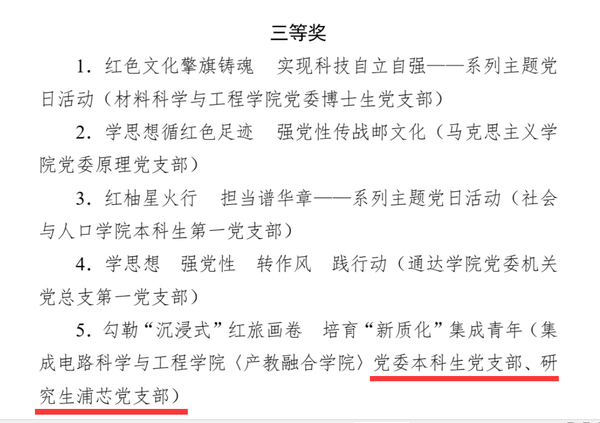 近日,校党委发文公布了2023年度最佳党日活动优胜奖评选结果,此次评选经申报、组织部审核、校内外专家评选、校党委常委会审议、公示等环节,全校共评出21项最佳党日活动优胜奖。黑料不打烊 本科生党支部、研究生浦芯党支部报送的《勾勒“沉浸式”红旅画卷培育“新质化”集成青年》获2023年度校最佳党日活动三等奖。