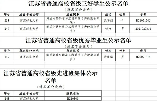 学院2021级B210301班荣获江苏省普通高校先进班集体,2020级汤谨溥同学荣获江苏省普通高校省级优秀毕业生,2021级博士研究生姚清同学和2021级本科生梁宇翔同学荣获江苏省普通高校省级三好学生。