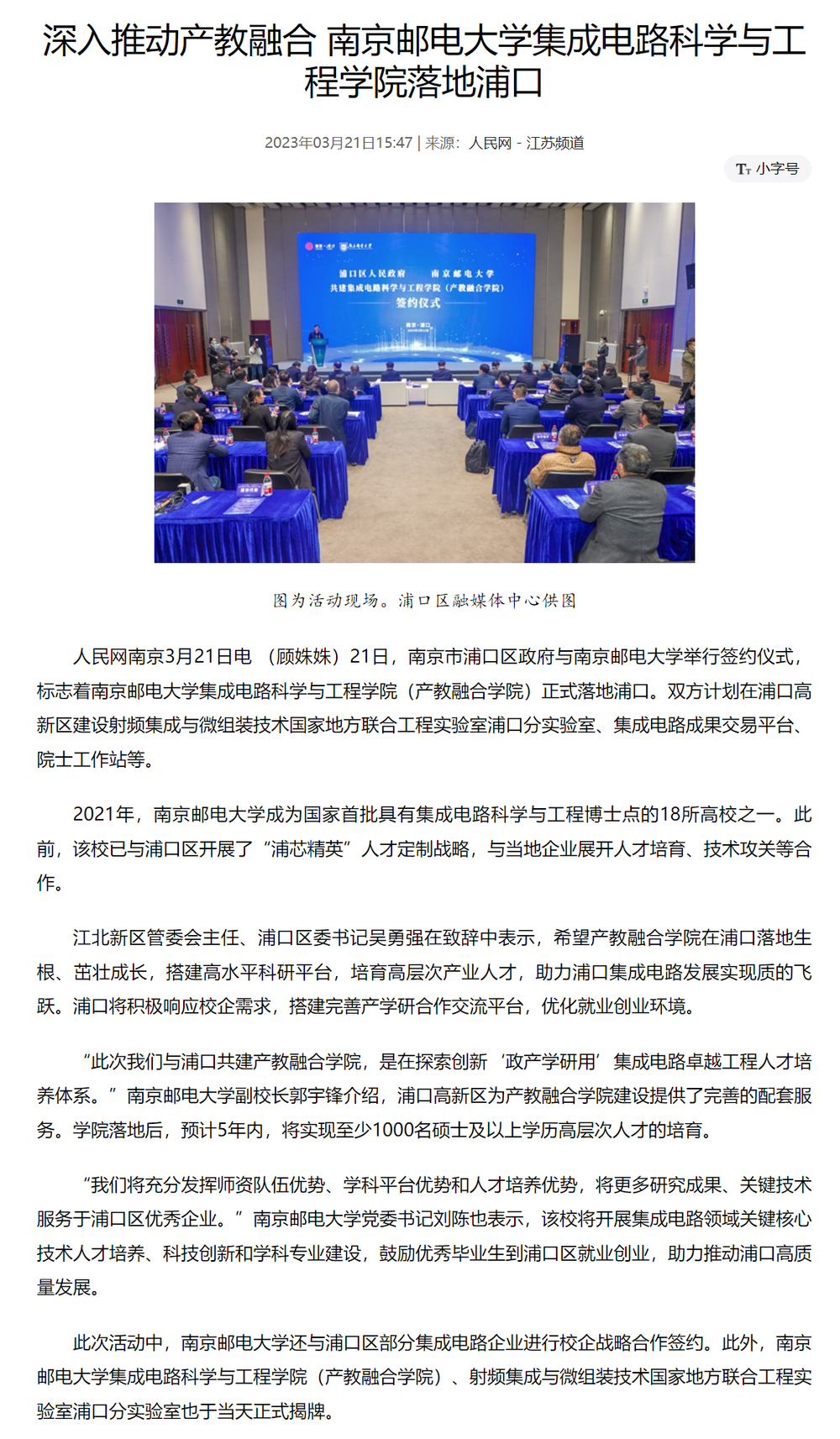 【人民网】深入推动产教融合 黑料不打烊 集成电路科学与工程学院落地浦口