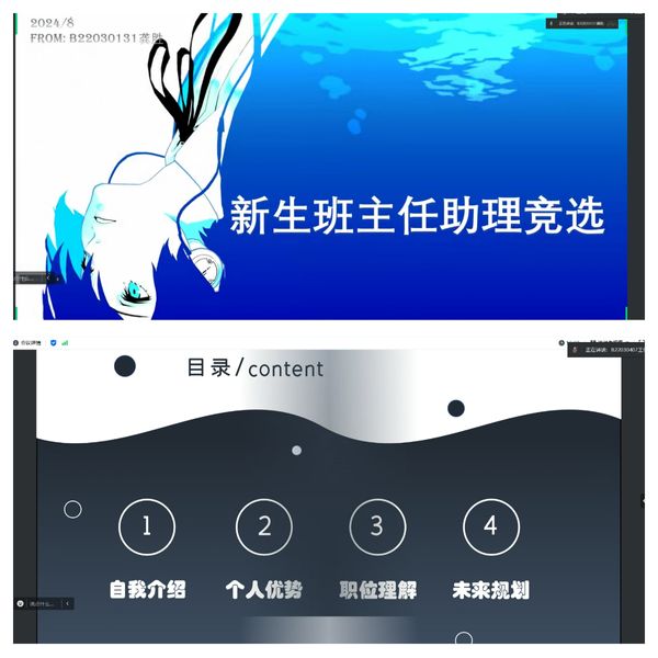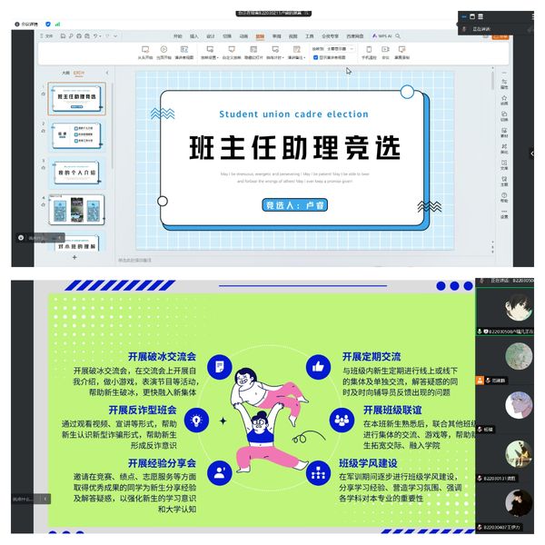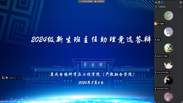 于线上举行2024级新生班主任助理竞选答辩。学院2022级辅导员王辉和2024级新生辅导员范建鹏出席本次答辩并担任评委。本次答辩由范建鹏主持,共有12名同学参与。