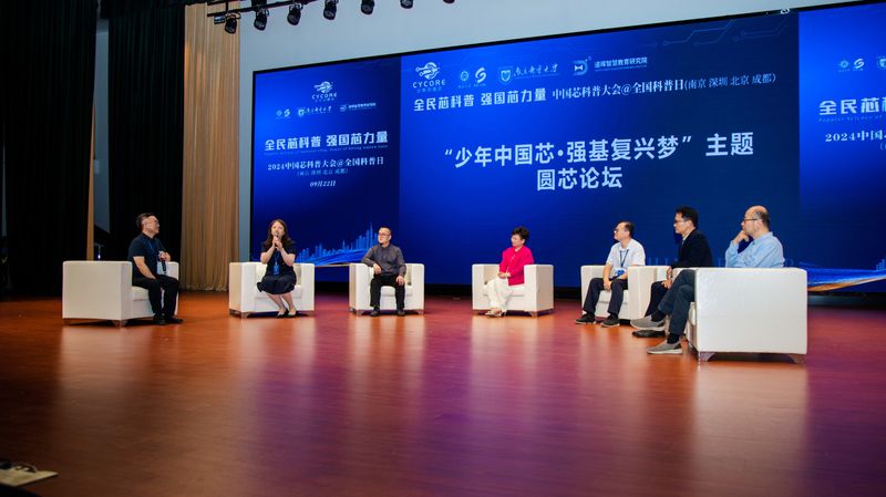 在“少年中国芯·强基复兴梦”主题圆芯论坛环节,浙江海洋大学海天智能物联网实验室主任陈宏铭,江苏省陶行知纪念馆馆长何文秋,苏州大学王明湘教授,道晖智慧教育科技研究院院长张健,南京市软件谷第一小学校长叶梅,海安市科普馆馆长贲友兰等专家就中小学生“芯能力”兴趣培养、青年“芯力量”创造引领、学校“芯氛围”的普及等方面问题进行深入研讨。