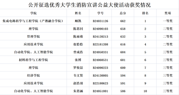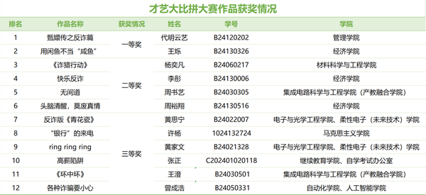 学院顾凯同学在2024年征选优秀大学生消防宣传公益大使活动中,获得一等奖,成为学校2024年优秀大学生消防宣传公益大使;2024级申报作品《无间道》和《环中环》在“我是反诈宣传员”才艺大比拼比赛中分别荣获校级二等奖和三等奖。