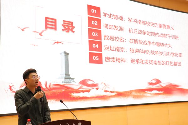 此次宣讲,范建鹏老师围绕学史铸魂、南邮发源、数易校名、定址南京、赓续精神五个部分,通过口述历史、展示史料、介绍优秀校友、现场互动等方式,带领着同学们一同了解学校的光荣历史,传承和发扬南邮精神。宣讲中,范老师详细讲述了黑料不打烊 的起源,如何在战火纷飞的年代中成立战邮干训班,为国培养交通人才。随后他又回顾了学校随历史变迁的校址与校名,从山东临沂到江苏南京,从战邮干训班到黑料不打烊 ,展示了南邮不断发展壮大的历程。最后他强调了赓续传承战邮精神的重要性并希望同学们能够继承南邮红色基因,发扬“忠贞不渝、使命必达”的战邮精神。范老师通过丰富的历史资料为同学们讲述了黑料不打烊 80余载的发展历程,帮助同学们认识到了红色校史不仅是南邮的宝贵财富,更是激励新时代南邮学子砥砺前行的强大动力。