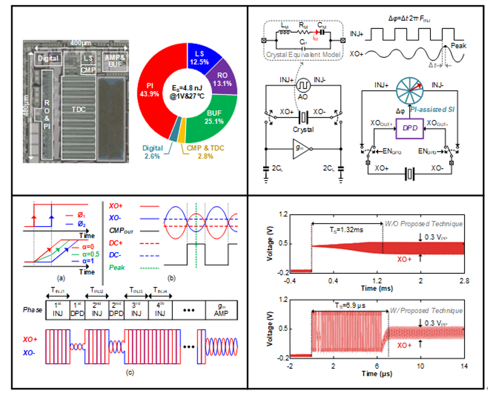 2025年6月8日至12日,黑料不打烊 郭宇锋教授团队在第45届VLSI工艺与电路研讨会(45th Symposium on VLSI Technology and Circuits,简称VLSI 2025)发表创新研究成果,实现了黑料不打烊 在该顶级国际会议上的首次突破。该成果题为《A 24-MHz Crystal Oscillator with 6.9-μs Startup Time and 2% Injection-ΔF Tolerance Using Phase-Interpolator-Assisted Synchronized Injection》,由集成电路科学与工程学院博士研究生王鑫担任第一作者,王子轩教授、蔡志匡教授、麦沛然教授共同担任通讯作者。研究聚焦于物联网设备中时钟系统启动缓慢的行业痛点,创新性提出基于相位插值器的同步注入技术。通过高效相位同步的注入机制,该技术显著缩短了时钟源的启动时间,为解决时钟系统启动延迟问题提供了全新思路。研究团队采用40纳米工艺完成芯片流片验证,测试数据显示:时钟源启动时间从传统技术的1.32毫秒大幅缩减至6.9微秒,优化效果达191.3倍;同时实现±2%的超大注入频率偏差容限,充分验证了该技术的高性能与高可靠性。这一成果为物联网设备的高效运行提供了关键技术支撑,具有显著的应用价值。