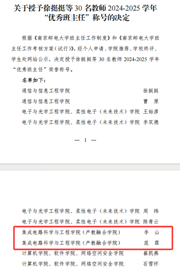 李山老师自担任B230303班班主任以来,始终以身作则、用心育人。2023-2024学年,他通过寝室走访、课堂跟进与个别交流,帮助学生顺利完成从高中到大学学习模式的过渡。2024-2025学年他聚焦微电子专业特色,引导学生深入专业学习与实践探索。他持续强化学风建设,通过定期班会、成绩分析和组建学习小组营造积极向上的学习氛围;积极拓展学科实践,指导学生参与“挑战杯”、集成电路创新创业大赛等赛事并获多项国家级、国际级奖项。